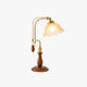 This table lamp is made of iron and glass. The lamp post and base are made of iron, and