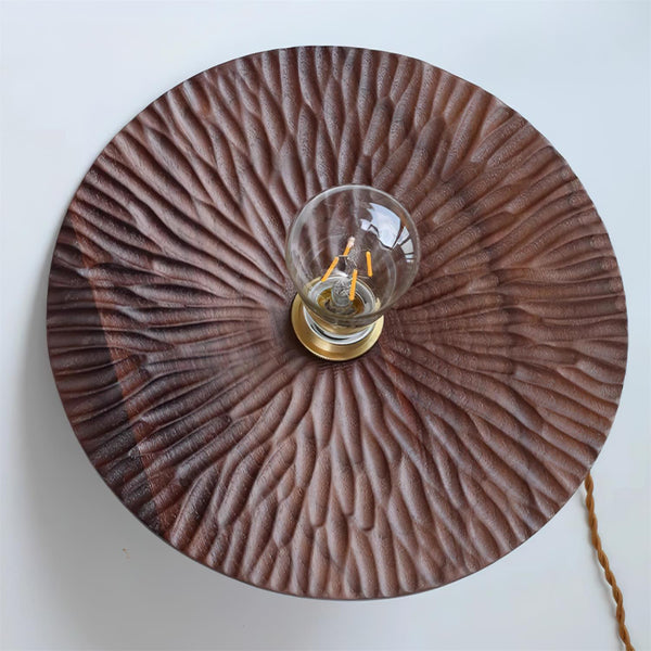 It consists of a wooden round lampshade and a transparent bulb. The wooden