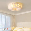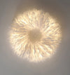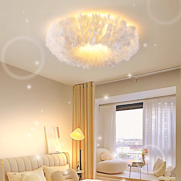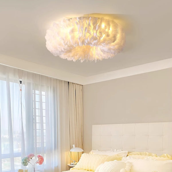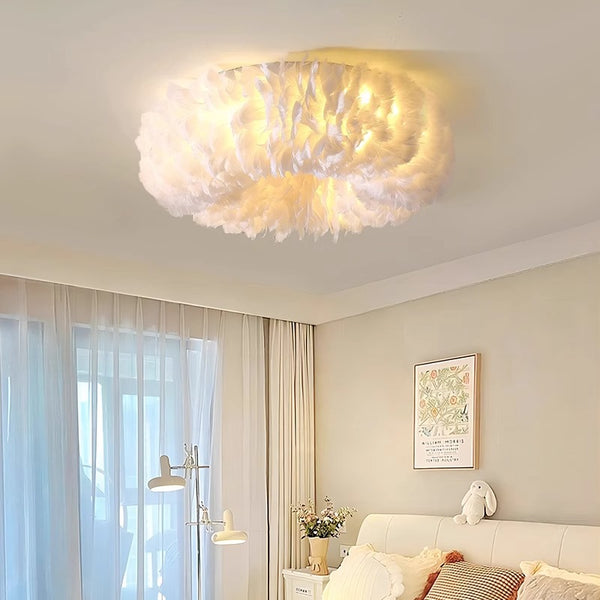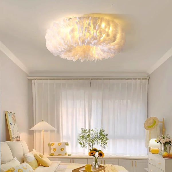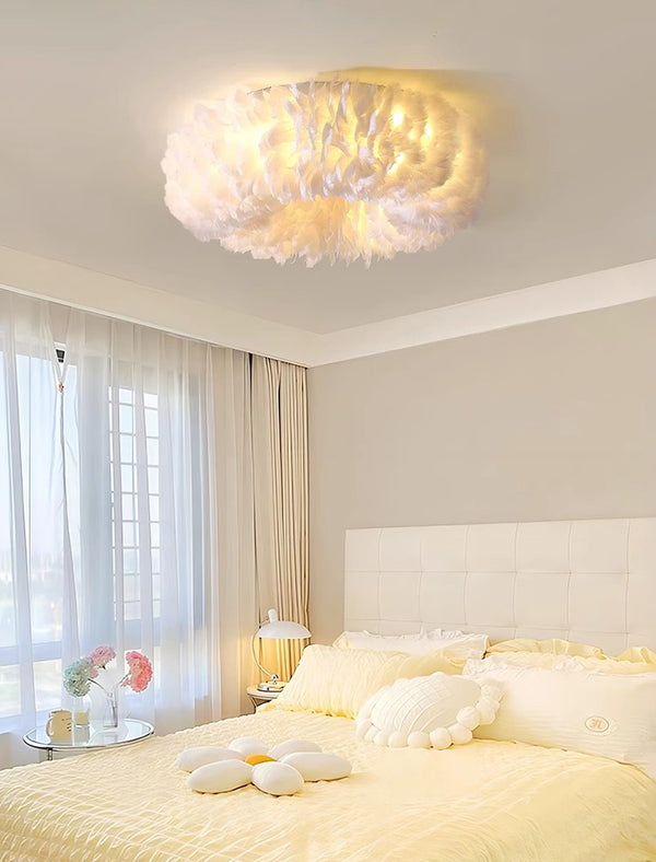 This ceiling lamp is made of white feathers as the main material. It is oval in shape. The
