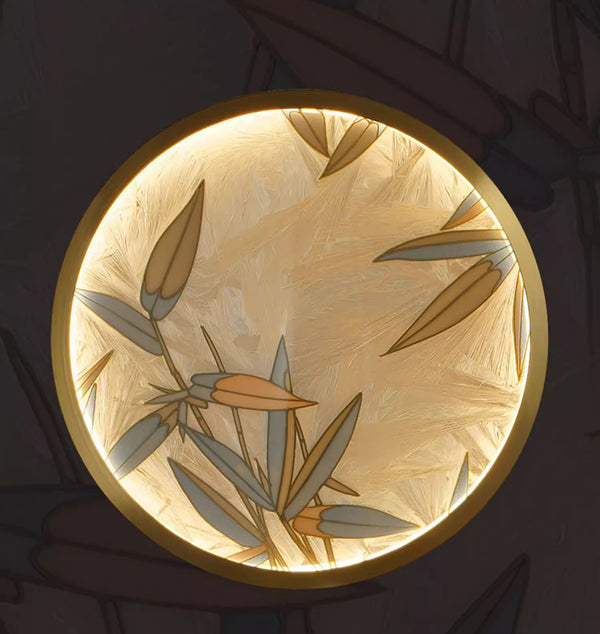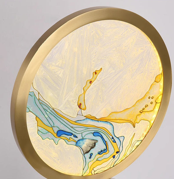 frame. Inside the ring is a textured translucent panel decorated with different patterns. It
