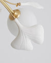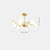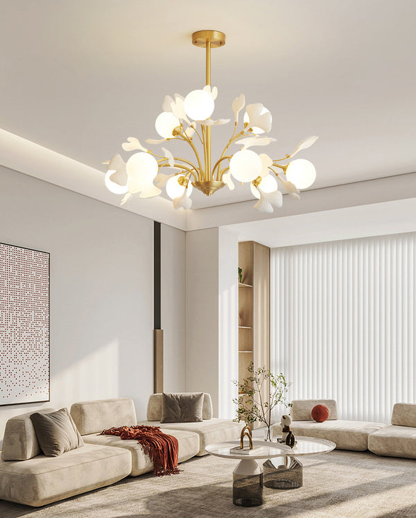 It consists of multiple white spherical lampshades and golden metal brackets. The metal