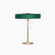This brass table lamp has an adjustable arc-shaped lamp pole, a hemispherical