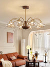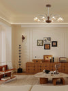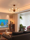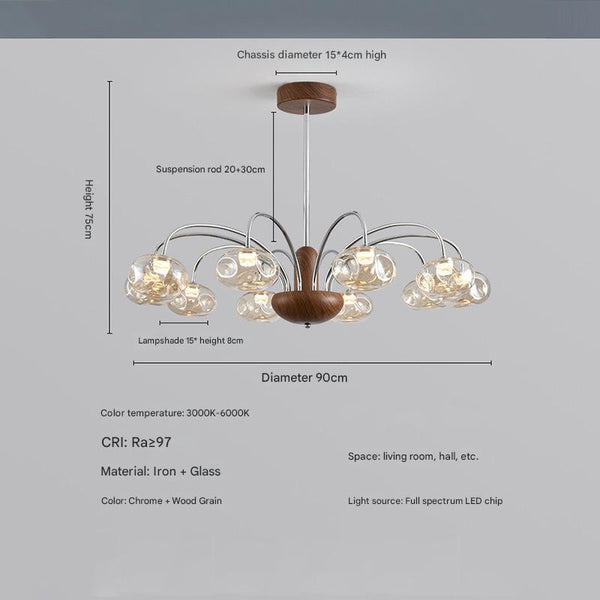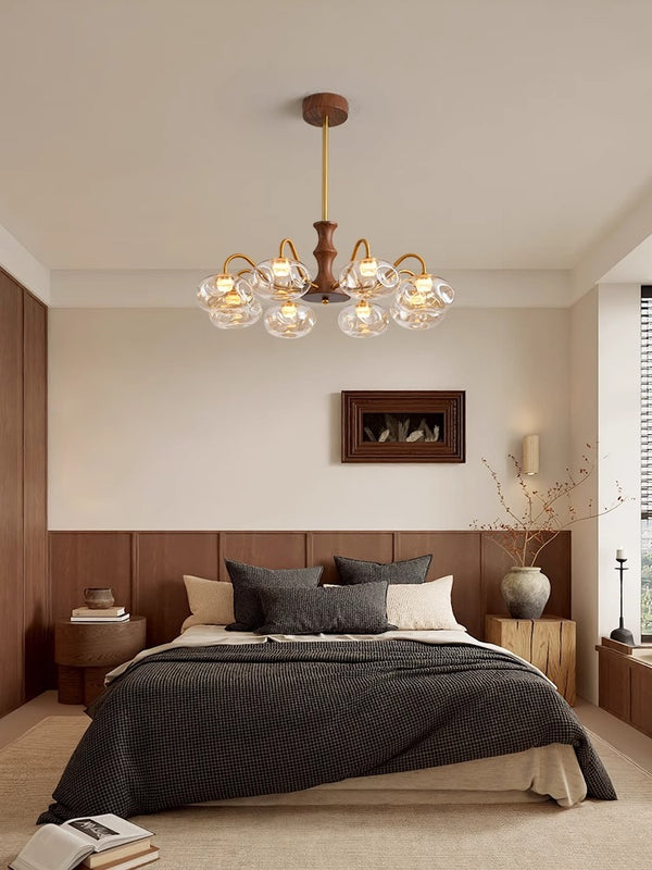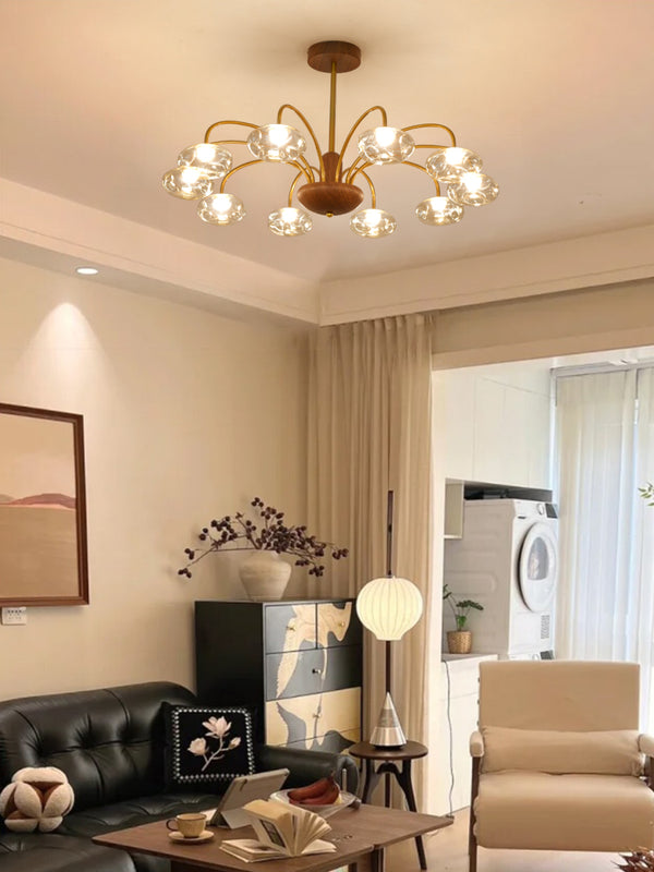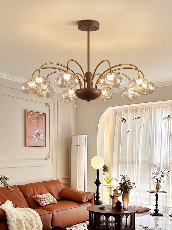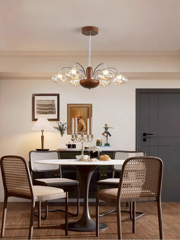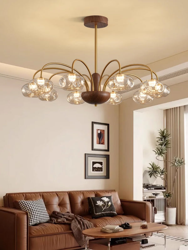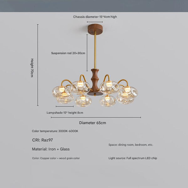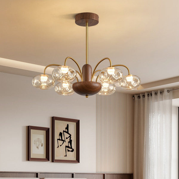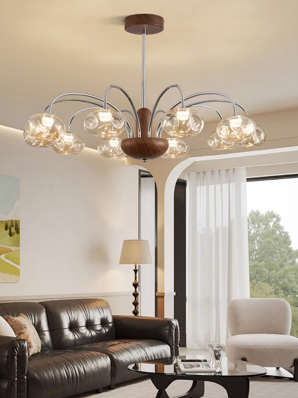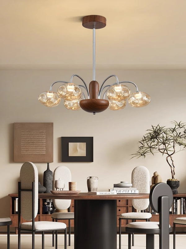 French mid-century style walnut grain glass living room chandelier